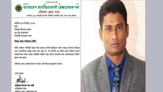 বৃহস্পতিবার (১১ সেপ্টেম্বর) জেলা শাখার দপ্তর থেকে প্রেরিত নোটিশে তাকে আগামী ২৪ ঘণ্টার মধ্যে লিখিতভাবে জবাব দেয়ার পাশাপাশি স্ব-শরীরে উপস্থিত হওয়ার নির্দেশ দেয়া হয়েছে।