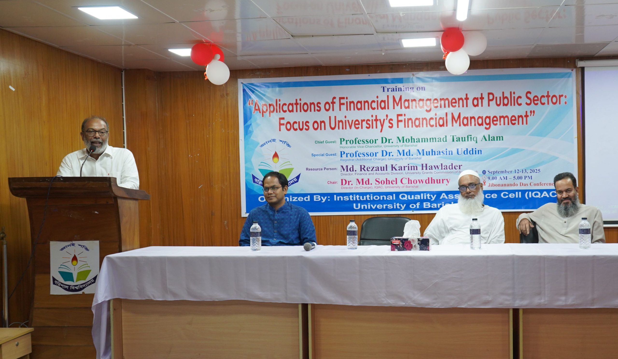 বরিশাল বিশ্ববিদ্যালয়ে ইনস্টিটিউশনাল কোয়ালিটি এস্যুরেন্স সেল (আইকিউএসি) এর আয়োজনে শুরু হয়েছে ২দিনব্যাপী প্রশিক্ষণ কর্মশালা। ১২ ও ১৩ সেপ্টেম্বর ২০২৫ তারিখ বিশ্ববিদ্যালয়ের জীবনানন্দ দাশ কনফারেন্স হলে Applications of Financial Management at Public Sector: Focus on University’s Financial Management শীর্ষক এ কর্মশালার আয়োজন করা হয়। ১২ সেপ্টেম্বর সকাল ৯:০০ টায় কর্মশালার উদ্বোধন করেন প্রধান অতিথি বরিশাল বিশ্ববিদ্যালয়ের মাননীয় উপাচার্য প্রফেসর ড. মোহাম্মদ তৌফিক আলম। বিশেষ অতিথি ছিলেন বিশ্ববিদ্যালয়ের রেজিস্ট্রার (অতিরিক্ত দায়িত্ব) প্রফেসর ড. মোঃ মুহসিন উদ্দীন। আইকিউএসির ভারপ্রাপ্ত পরিচালক ড. মোঃ সোহেল চৌধুরীর সভাপতিত্বে কর্মশালায় বহিস্থঃ প্রশিক্ষক ছিলেন বিশ্ববিদ্যালয় মঞ্জুরী কমিশন (ইউজিসি) এর অর্থ, হিসাব ও বাজেট বিভাগের পরিচালক মোঃ রেজাউল করিম হাওলাদার। ২ দিনব্যাপী আয়োজিত এ কর্মশালায় বিশ্ববিদ্যালয়ের ৫৩ জন শিক্ষক ও কর্মকর্তা প্রশিক্ষণ গ্রহণ করবেন।