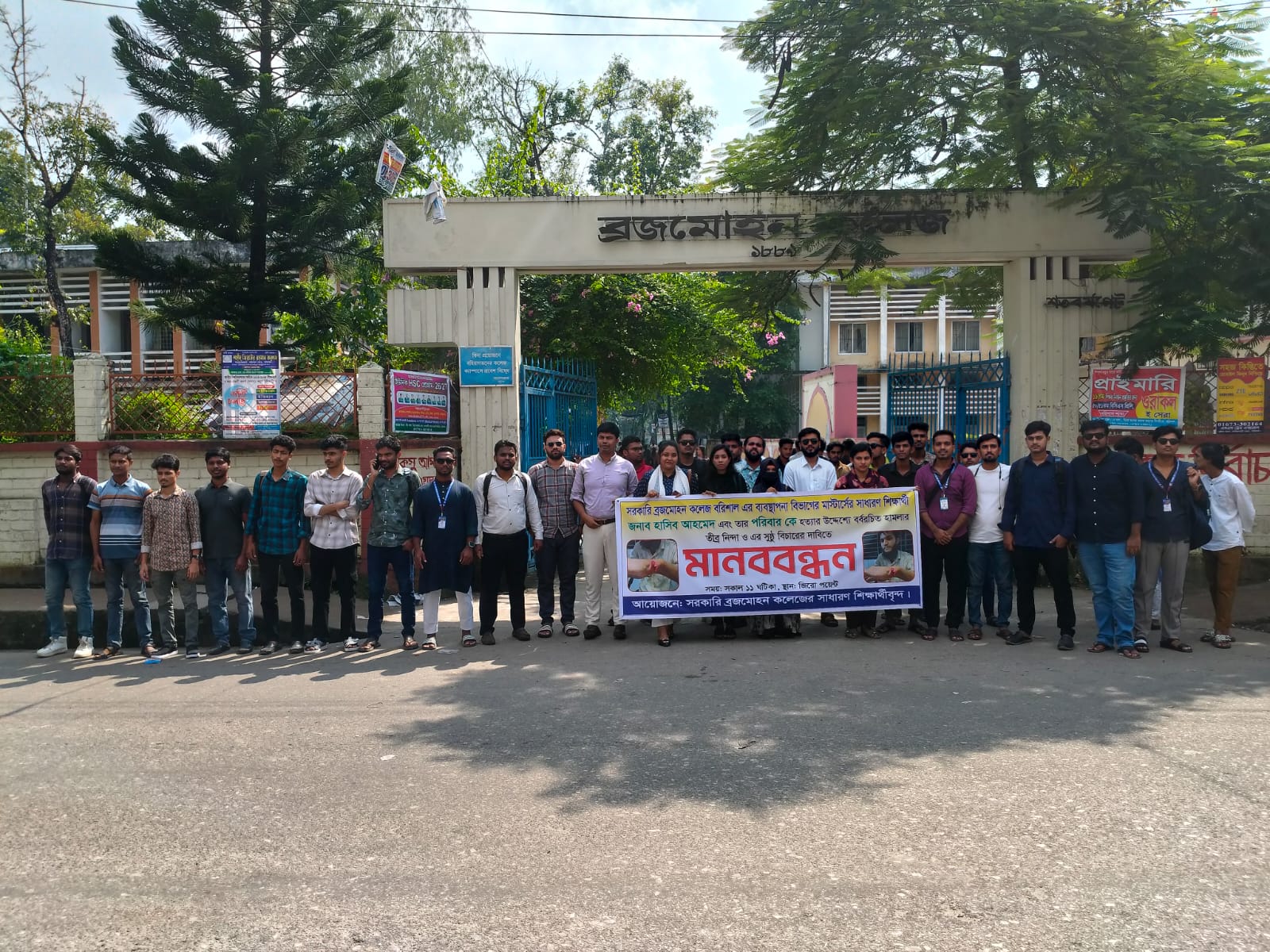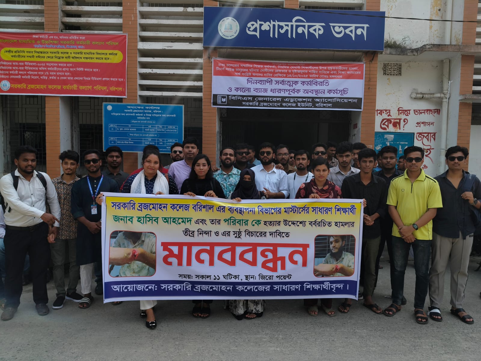 বরিশাল সরকারি ব্রজমোহন (বিএম) কলেজ ক্যাম্পাসে এক শিক্ষার্থী ও তার পরিবারের ওপর বর্বরোচিত হামলার প্রতিবাদে মানববন্ধন করেছে সাধারণ শিক্ষার্থীরা।